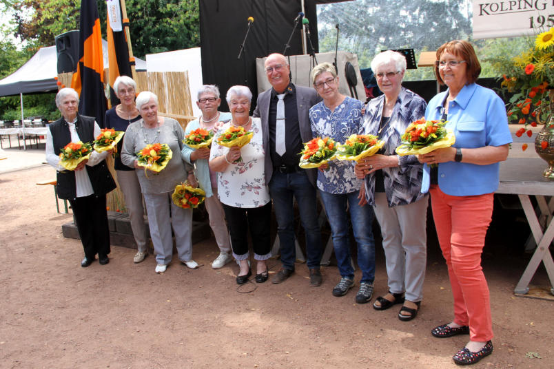 70-jähriges Jubiläum würdevoll und groß gefeiert Mit einem Festhochamt in unserer St. Wendalinus-Kirche feierten wir am 24. August 2025 das 70-jährige Bestehen unserer Kolpingsfamilie. Mit den Bannerträgern aus Dirmingen, Illingen, Humes, Schmelz, Marpingen und Namborn unter den Klängen des Fanfarenzugs der Kolpingsfamilie Humes zogen Pastor Achim Thieser mit der Messdienerin, den beiden Diakonen Stefan Leinenbach und Hugo Nauman sowie den beiden Vorsitzenden Hans-Peter Hoffmann und Frank Schlicher in unsere Pfarrkirche ein. In seiner Predigt ging Pastor Achim Thieser sehr detailliert auf die Wurzeln und das Wirken von Adolph Kolping ein, zog dabei Parallelen zu heute und stellte die Gemeinschaft als das wesentliche Element in der (Kolping-)Familie heraus. Es war eine würdevolle Messfeier, zu der insbesondere die Bannerträger, Organist Herr Gaida und der Fanfarenzug der Kolpingsfamilie Humes wesentlich beitrugen.Nach der heiligen Messe zogen wir dann gemeinsam zum Außengelände der Rothenbergschule, deren Außenplatz mit Küche, Ausstellungsraum und Sanitäranlagen uns von der Geschäftsführung, Herrn Latz, und Schulleitung, Herrn Peter Engel, kostenlos zur Verfügung gestellt wurden. Für diesen echten Freundschaftsdienst bedanken wir uns in aller Form. Zum Frühschoppen spielte dann der Fanfarenzug der KF Humes auf, ehe es dann zum Mittagessen überging. Hier sorgten das Team der Metzgerei Lambert und unsere Kolpingsfrauen für einen reibungslosen Ablauf. Nach dem Mittagstisch begrüßte unser Vorsitzender Hans-Peter Hoffmann neben dem Landesvorsitzenden von Kolping Saar und gleichzeitigen Diözesanvorsitzenden unseres Bezirks Norman Karpe, Bürgermeister Dr. Andreas Feld, der auch als Schirmherr fungierte, Frank Klein, Ortsvorsteher von Dirmingen, Horst Schiwak, Bezirksvorsitzender, Thomas Latz, Geschäftsführer der Lebenshilfe Neunkirchen, Werner André, Vorsitzender der Lebenshilfe Neunkirchen sowie Peter Engel, Schulleiter der Rothenbergschule und last not least Circe Meiser und Marliese Kern, Pfarrgemeinderat bzw. Pfarrverwaltungsrat der Pfarreiengemeinschaft Eppelborn-Dirmingen und Vertreter der politischen und örtlichen kulturtreibenden Vereine und insbesondere unsere Jubilare und Gäste aus Nah und Fern. Vorsitzender Hans-Peter Hoffmann ging in einer kurzweiligen Rückschau auf die Gründung der Kolpingsfamilie Dirmingen und deren Wirken bis zum heutigen Tag ein. Ganz besonders dankte er den verstorbenen Ehrenvorsitzenden Edmund Jochem und Willibald Spaniol sowie allen lebenden und verstorbenen Gründungsmitgliedern, die mit beispielslosem Engagement die Basis geschaffen hätten, dass die Kolpingsfamilie heute fest verankert im Dirminger Vereinsleben und darüber hinaus eingebunden sei. Zusammen stehen, Mut haben, Zivilcourage beweisen und solidarisch handeln im Sinne des Gesellenvaters Adolph Kolping und zum Wohle des Nächsten seien fundamentale Werte, nach denen die Kolpingsfamilie ihre Arbeit auch künftig ausrichteten wolle.Dem schlossen sich auch Bürgermeister Dr. Andreas Feld, der Diözesanvorsitzende Norman Karpe sowie Ortsvorsteher Frank Klein an, die ebenfalls die Arbeit der Kolpingsfamilie würdigten und deren Stellenwert für das kulturelle und gesellschaftliche Leben in Dirmingen herausstellten.Nach den Gruß- und Gratulationswünschen unserer Gäste zeichnete unser Vorsitzende unsere verdienten Gründungsmitglieder mit einem Ehrengeschenk, einer Dankesurkunde und Ehrennadel aus.Für 60 Jahre treue Mitgliedschaft wurden geehrt:Herbert Detzler, Karl-Heinz Kuhn, Dieter Lambert. Für 50 Jahre Martin Kauth. Für 40 Jahre: Matthias Hoffmann, Robert Scherer, Roland Saar,und Silvia Hansen. Für 25 Jahre: Liane Ulrich und Oliver Graus. Eine besondere Ehrung erfuhren Hans Baltes als ältestes Mitglied und Herbert Giese als einzig noch lebendes Gründungsmitglied.Eine letzte große Ehre erwiesen wir noch unserem in diesem Jahr verstorbenen Gründungsmitglied Josef Pulch posthum, dessen krankheitsbedingt fehlender Ehefrau Wilma wir noch ein Jubiläumsgeschenk mit Urkunde und Ehrennadel überreichen werden.Eine gelungene Überraschung bot sich am Ende der Ehrungen, als unser Vorsitzende lang verdienten Kolpingsfrauen, die viele Jahrzehnte mit ihrem Einsatz unsere Kolpingsfamilie uneigennützig unterstützten, einen Blumenstrauß überreichte. Vielen Dank an dieser Stelle an Ursula Spaniol, Christel Detzler, Josefa Kauth, Marliese Schlicher, Christel Hautz, Claudia Metzinger, Hildegard Giese und Ursel Lambert.Danach feierte man noch bei Kaffee und Kuchen, einem frisch gezapften Pils und Crémant bis in die späten Nachmittagsstunden. Es war eine würdevolle und noch lang nachhaltende Jubiläumsfeier.Für die der Kolpingsfamilie Dirmingen überbrachten Glückwünsche und Geldspenden bedanken wir uns ganz herzlich bei: Bürgermeister Dr. Andreas Feld, Ortsvorsteher Frank Klein, Landfrauen, Sportverein, Turnverein, CDU-Ortsverein, SPD-Ortsverein, Kulturverein, Löschbezirk der freiwilligen Feuerwehr Dirmingen, Rothenbergschule, Kolpingbezirk Illingen, Kolpingsfamilien Illingen, Humes, Namborn und St. Wendel.Über die sonstigen Glückwünsche haben wir uns ebenfalls sehr gefreut. Vielen Dank allen, die dazu beigetragen haben, dass wir einen wunderschönen und gelungenen Jubiläumstag miteinander feiern durften. Allen Gästen sagen wir ein herzliches Wort des Dankens für Ihr Kommen. Wir hoffen, dass es euch gefallen hat. Ein inniges Treu Kolping.
